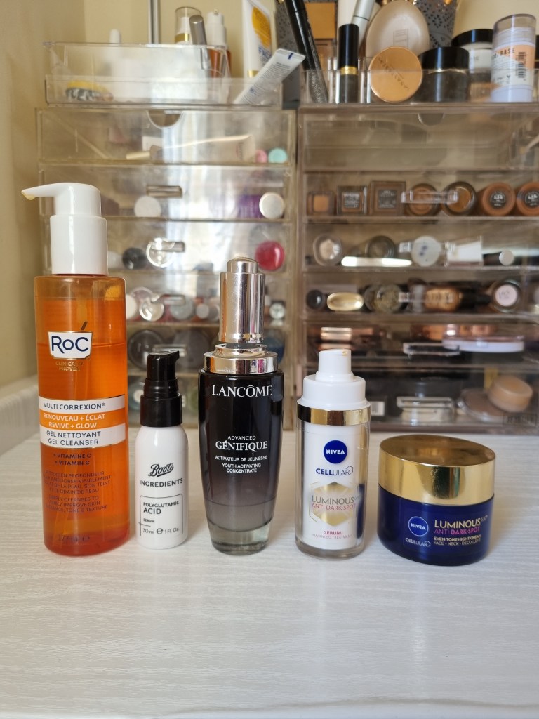I start with cleansing with – Roc Skincare Vitamin c cleanser (gifted) (I do a double cleanse if I’m wearing a lot of sunscreen/makeup) then its layering my serums. I’ve started using the Boots Polyglutamic serum which I am really loving so far and pleasantly surprised with. Then it’s my trusted Lancôme Advanced Genifique serum then the Nivea Luminous 630 Anti Dark Spot Serum, I have listed these in order of application. I finish off with Nivea Luminous 630 Anti Dark Even Tone Night cream. My skin has been feeling a little dry lately so I have been using the Clinique 72hr Moisture surge OR Sleep mask right before I sleep for extra hydration. I also intermittently use the Estee Lauder ANR Ampoules which I absolutely adore.