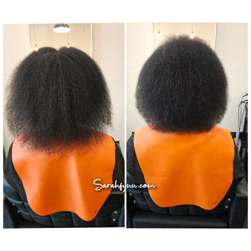 She explained what she would be doing. My hair was sectioned in 4, then these products were applied, the leave in first then detangled before the light hairdress. She blow dried first with a comb attachment before going in with a paddle brush to fully stretch the hair. I noticed she didn’t use a heat protectant so I asked her about this and whether the products she used had heat protection benefits. She said most heat protectants have drying alcohols and because natural hair can be naturally dry she prefers not to use them but the products used have some heat protection. She also recommended one, the Keracare thermal wonder. I felt a bit uneasy about this because I am so used to using a heat protectant before any heat. I can say though that the blow dryer wasn’t too hot( like what I’m used to) and there was no smoke when she was blow drying my hair.